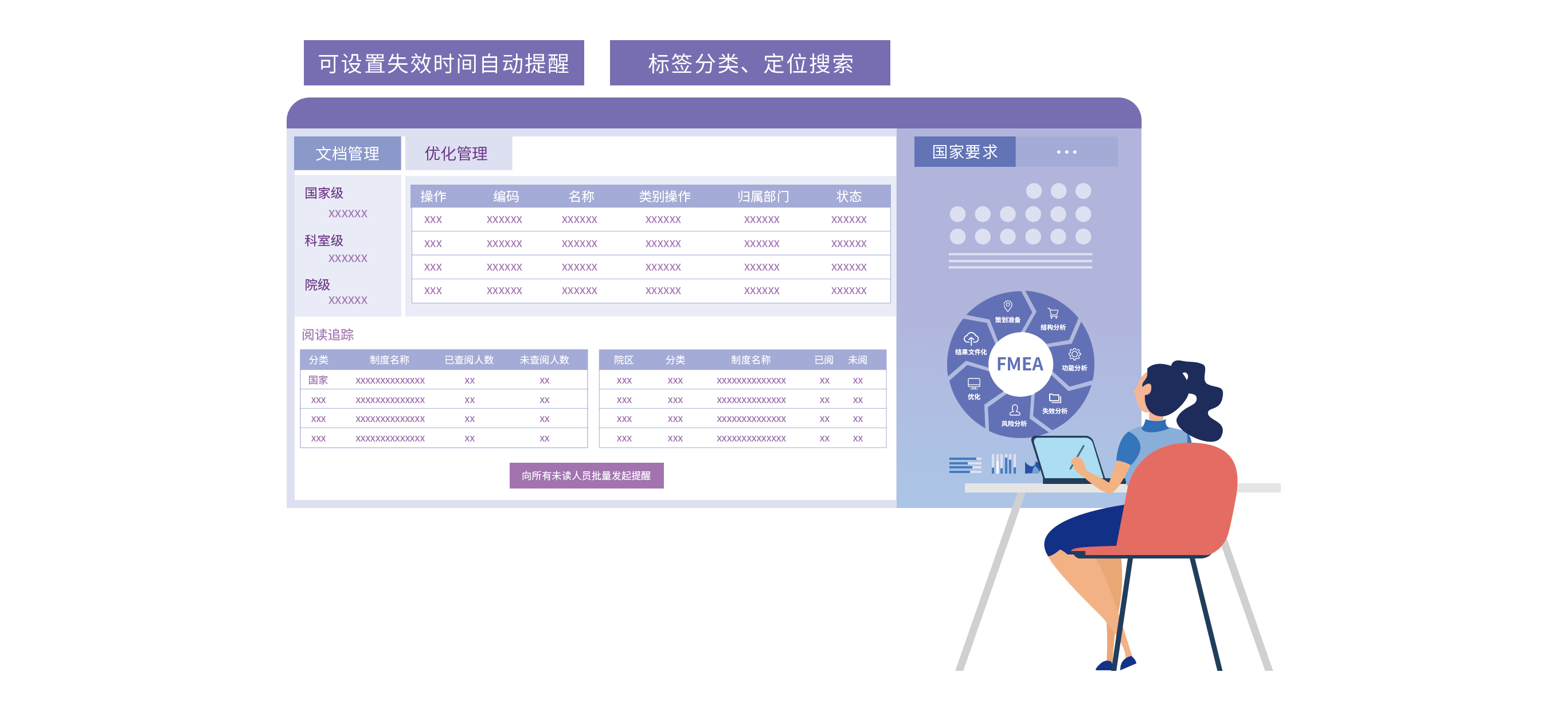 - 科室层级的制度管理包括科室制度文档管理、制度优化管理,可以设置失效时间自动提醒,解决制度传达效率低等问题。支持标签分类管理,方便定位搜索,能跟踪相关人员查阅制度情况,向未阅读人员批量发起提醒,保障制度执行。另外可根据国家、医院的要求,以及业务发展情况,通过FMEA方法及时分析制度执行过程中所存在的问题,优化流程,完善制度,实现风险防控。