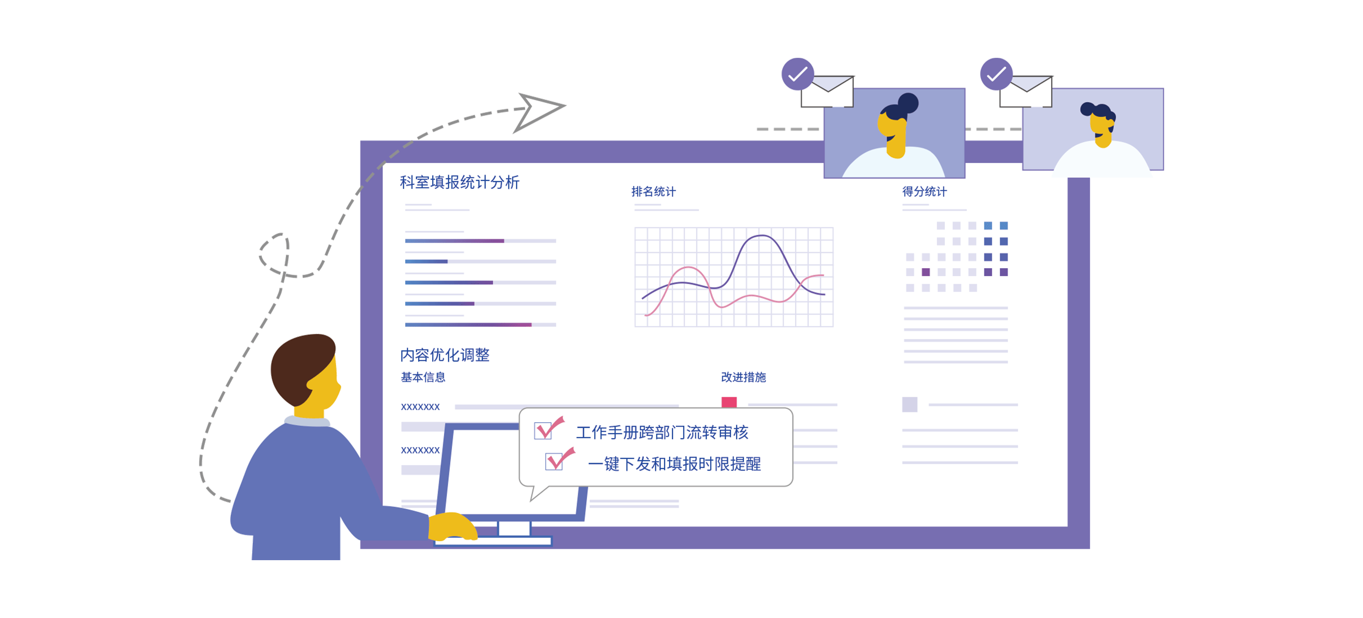 - 支持科室工作手册一键下发和填报时限提醒,自动汇聚各科室工作记录和评分排名比对分析,帮助医院及时掌握各科室的工作执行情况和存在问题,并可根据管理需要及时对手册内容进行优化调整,支持工作手册在跨部门间流转审核,促进院科两级工作协同,降低管理难度,推动科室工作质量精细化和有效管理。