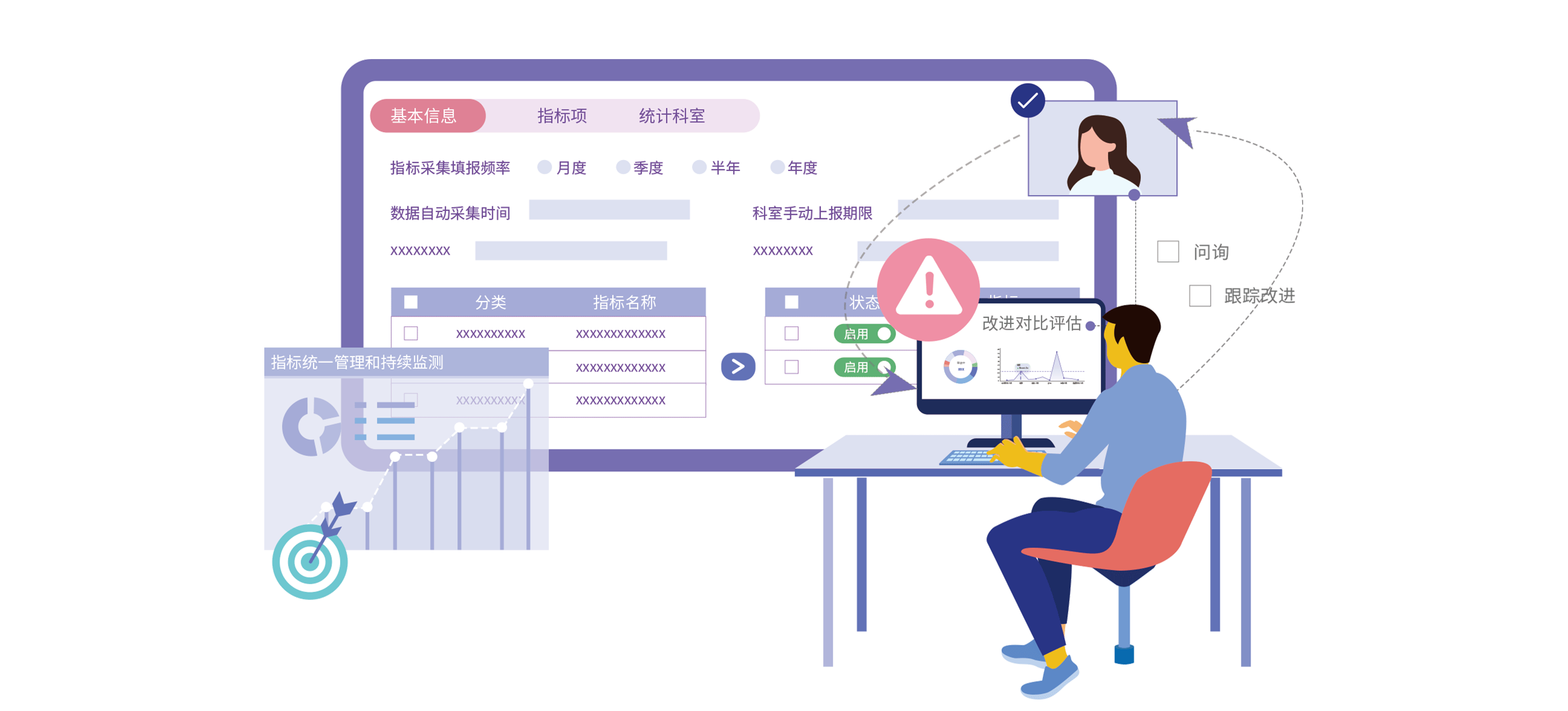 - 科室质量指标监控通过对指标的统一管理和持续监测,实现安全质量薄弱环节定位。根据管理需要和各指标的特点,构建多维度立体指标体系,灵活配置相应的指标方案和数据上报周期,实现质量安全精细化管理。质量管理部门可针对异常指标,向对应科室发起问询和跟踪改进措施执行情况,并对改进效果进行比对评估,补齐短板弱项,实现持续改进,促进科室质量管理的全面、精准、平衡发展。