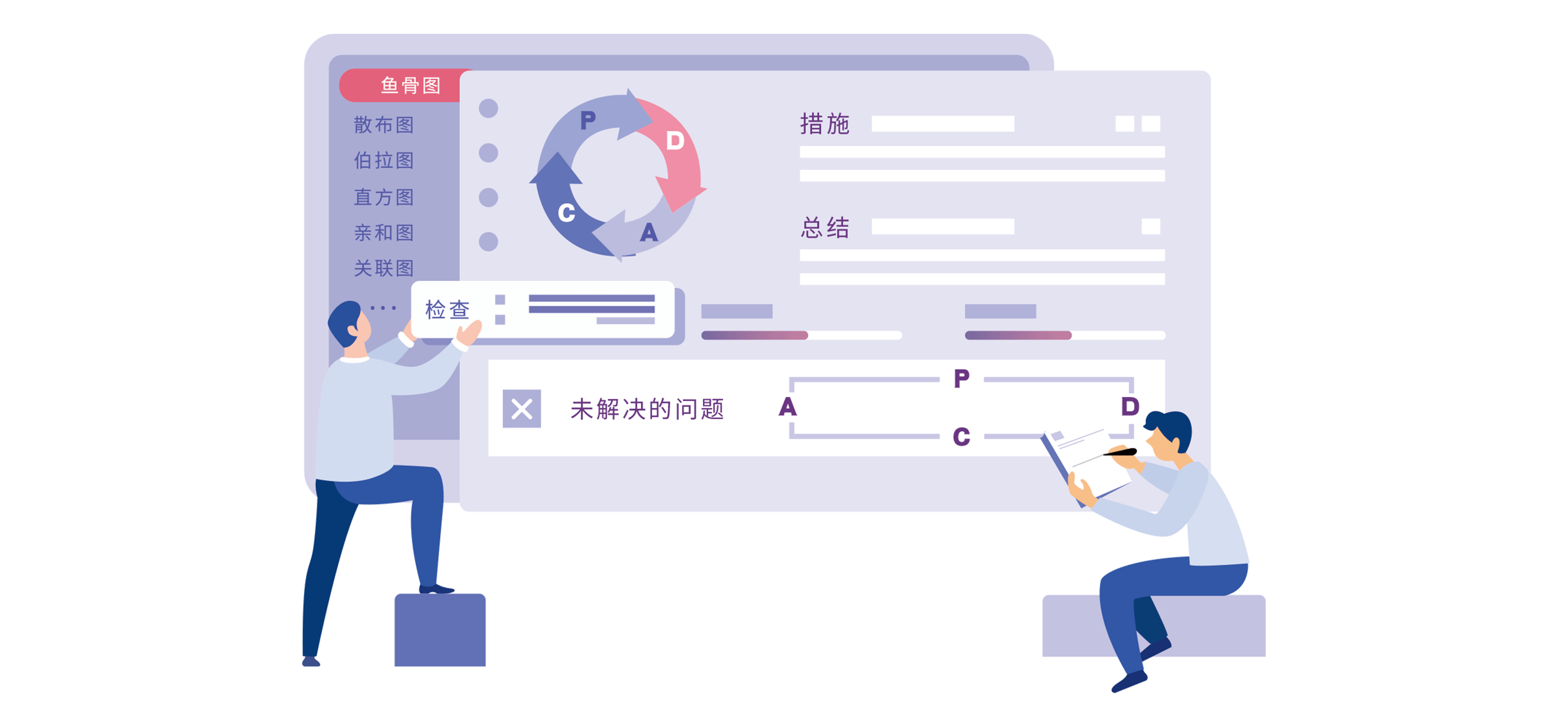 - 根据各科室督查结果所存在的问题修订、优化相关检查项目,内置丰富质控工具,支持鱼骨图、柏拉图等多种图表类型,在线绘图灵活便捷,以多种维度呈现检查结果,迅速掌握问题所在,使科室有针对性地进行PDCA改进。CQI小组可以根据任务执行情况进行检查,汇总有效措施、分析总结。对于PDCA执行后仍未能解决的问题,可根据实际情况进行PDCA循环,直到问题得以改进。