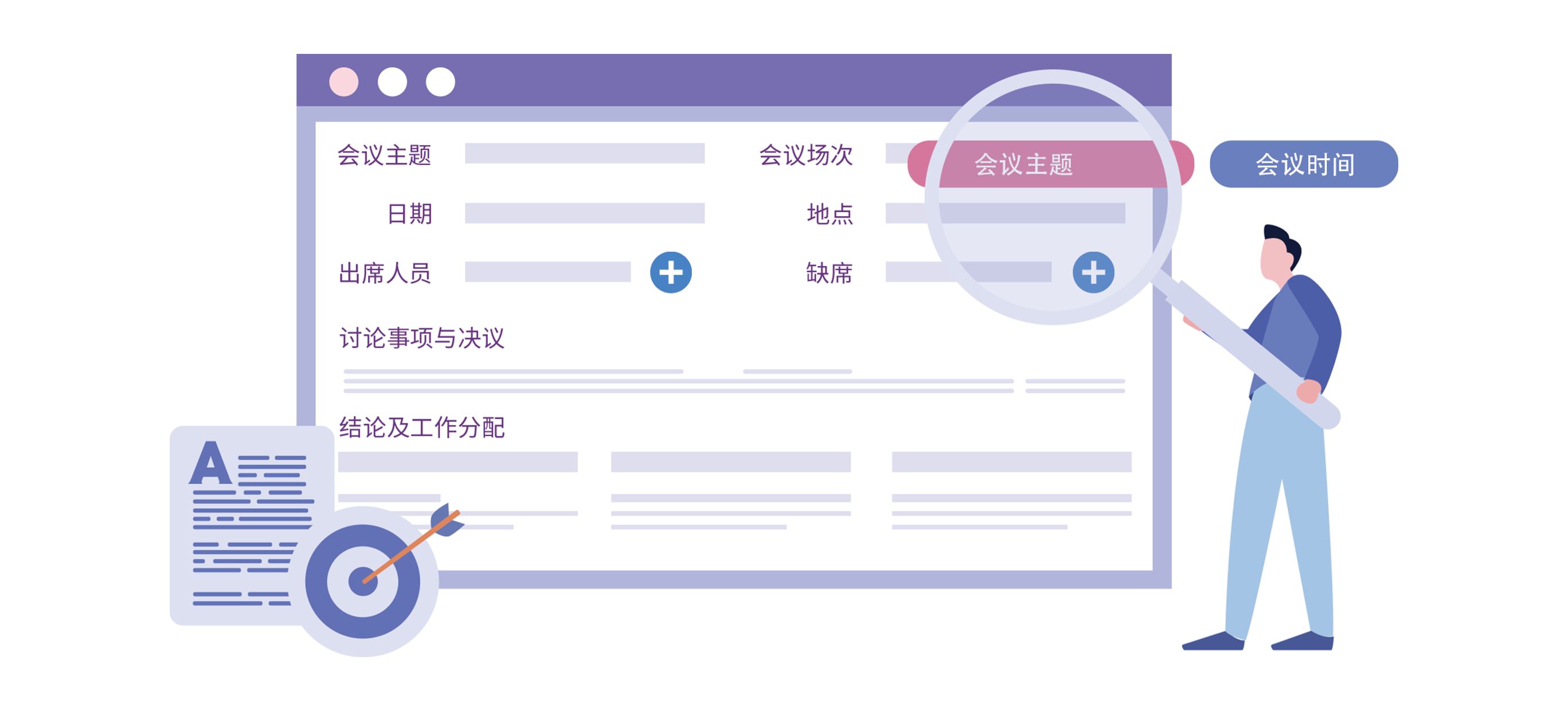 - 会议记录包括会议主题、日期、地点、出席人员、缺席人员、讨论事项与决议、结果及工作分配等内容。根据项目进行记录,支持会议主题、时间搜索,快速掌握项目的进程和发展情况。