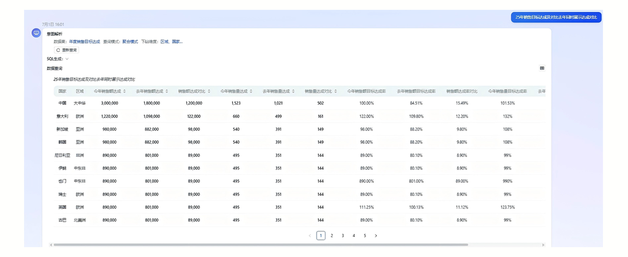 - 报表生成,如查询“25年销售目标达成及去年对比”,以“秒”的速度快速生成业务报表,可下载。同理,如日报、周报、月报、年报也可一句话生成。