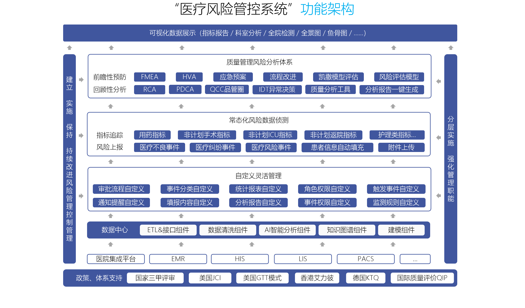 - 为充分发挥风险数据价值,实现医疗风险防范与规避,科进医疗风险管控平台打破传统数据孤岛,支持与风险事件上报、分析与持续改进等系统联动,风险数据自动关联使用,积极创新工作机制和方式方法,注重破除原有管理模式的部门、学科壁垒和工作障碍,提倡多部门、多学科有效协同,提高全院风险管控能力。