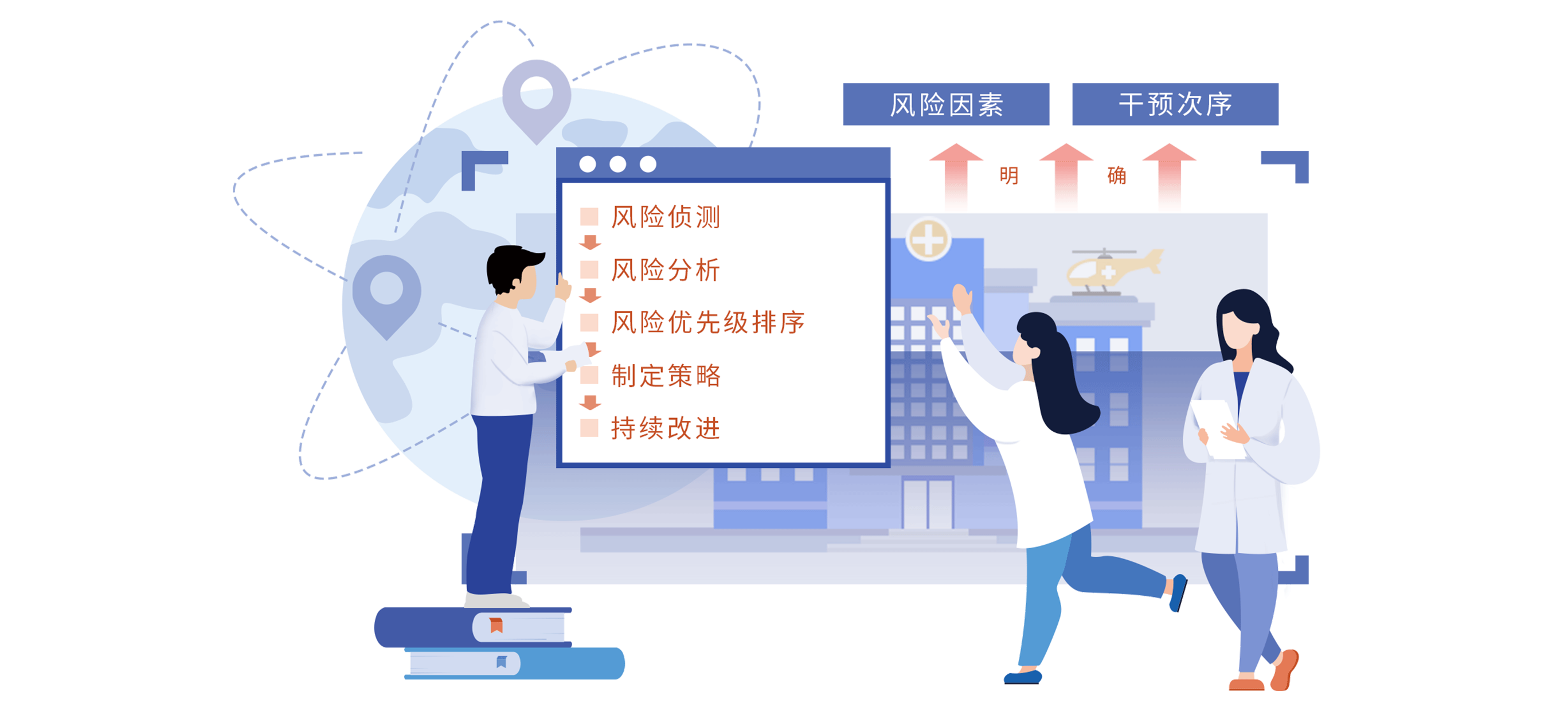 - 科进医疗风险管控平台,吸收并借鉴国内外著名医院风险管控理念及国家相关政策,协助医院定期开展风险因素科学评估,明确影响本机构面临的主要风险因素和优先干预次序。根据风险评估结果,合理设定或调整干预目标和策略。采取基于循证证据的干预措施,进行科学防控,避免防控过度和防控不足,协助医院全面推进多场景线上+线下混合式风险防控。