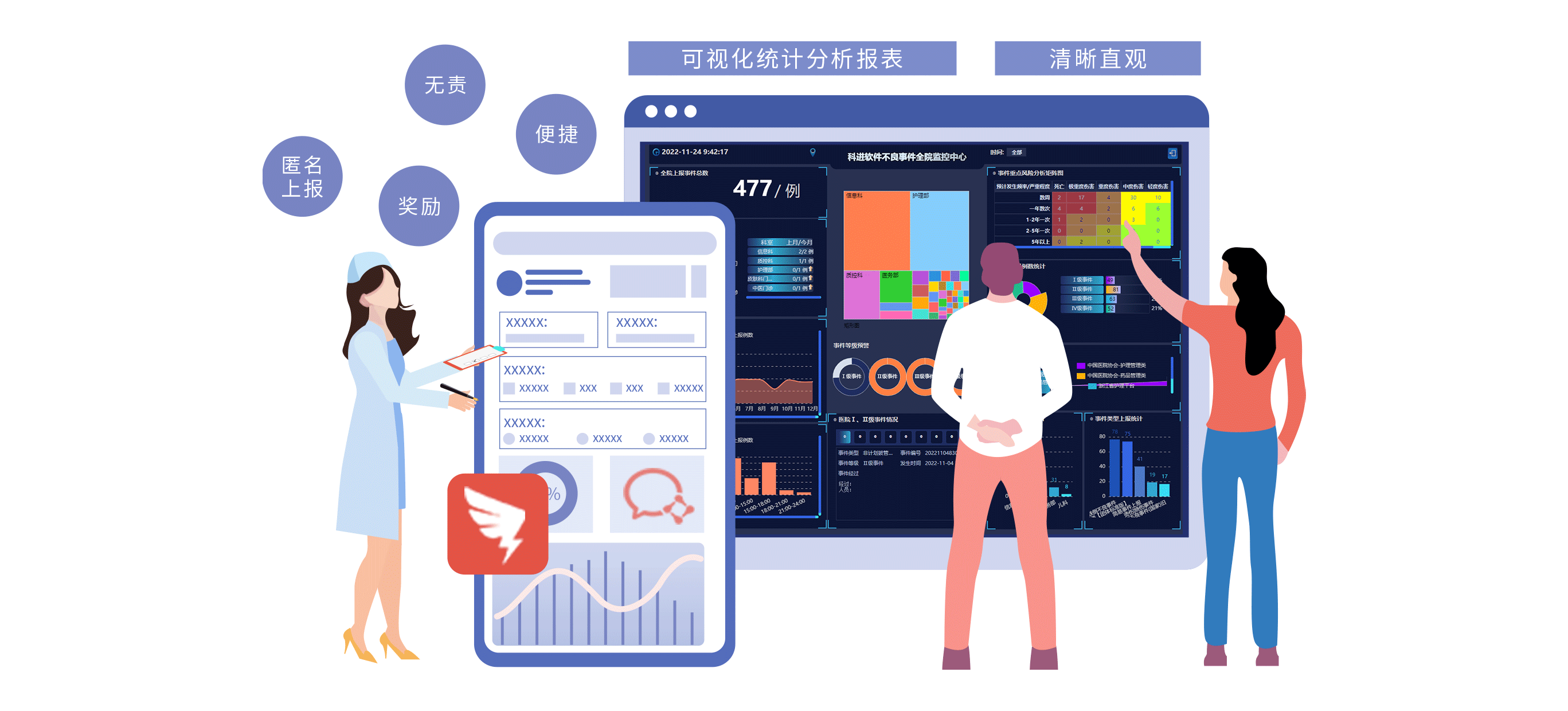 - 提供便捷的风险事件上报入口,表单采用单选、多选及下拉项选择,并支持匿名、无责或奖励式上报,减少用户操作时间,提高全院风险事件上报意愿。上报后,系统将一系列繁琐的表单选项、文本内容转变为可视化的统计分析报表,使得管理者能清晰直观的了解各级科室、部门的医疗风险情况。