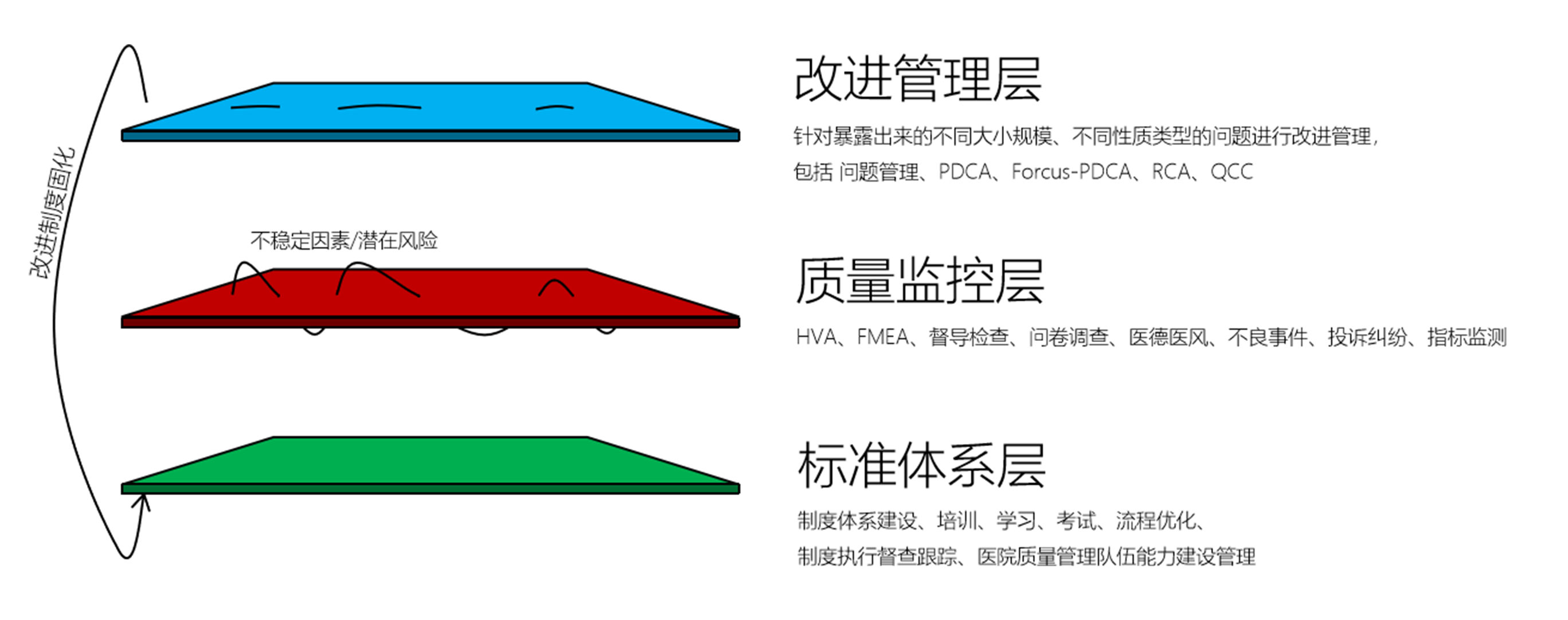 - 针对识别出来的风险问题,医院可利用平台中提供的PDCA、QCC品管圈系统及时制定应对措施及管理策略,最后形成院级风险管控知识库,通过院务公开、文化园地、学术交流等形式对医疗质量改进工作和改进成效进行广泛宣传,加强部门、科室间的交流,在院内营造良好的氛围,引导医务人员将医疗质量安全理念和医疗质量安全改进目标融入日常工作。