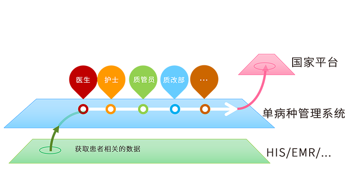 - 可为电子病历、HIS、护理系统等第三方应用系统提供数据接口,以减少医生护士在不同系统之间重复登录和界面切换的痛苦,一键进入指定患者上报界面,降低工作强度,提高工作效率,让病种上报更加便捷。