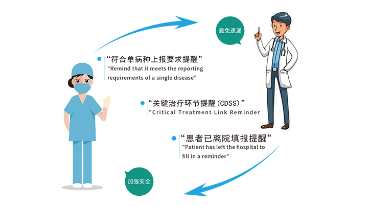 - 从患者入院到离院的整个围住院期,为管床医生和护士提供了“符合单病种上报要求提醒”、“关键治疗环节提醒(CDSS)”、“患者已离院填报提醒”三种提醒模式,在加强患者就诊安全的同时,避免信息记录出现遗漏,让质量有迹可循。
